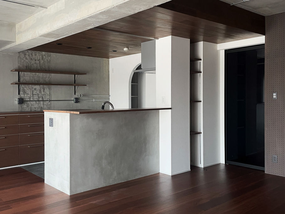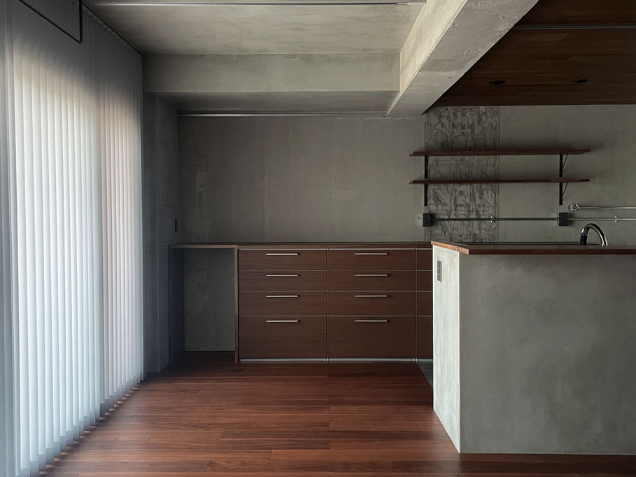 コンクリートやモルタルといったワイルドな素材感と木の質感が共存する空間を目指しました。界壁面はクロス下地のモルタルをそのまま仕上げとして使用し、その上から希釈した塗装をを薄く塗ることで全体の色味を整えています。