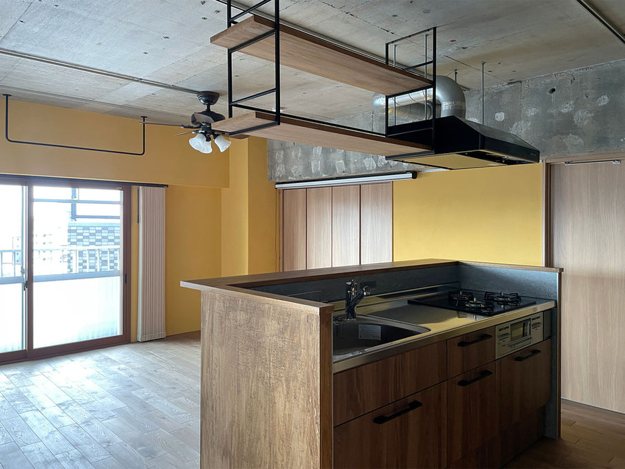 素材は、オーク材の無垢フローリングやシナ合板、コンクリート、しっくい等を使用しインダストリアルなテイストに仕上げています。マスタード色の西洋漆喰やタイル・ソファのグリーンがよいアクセントになっています。